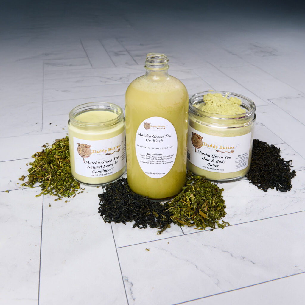 The Matcha green tea TRIO is a 3 part combination of a 100% natural plant-based unique co-wash, leave-in conditioner, and one of our flagship hair & body butters. This bundle of nature was formulated to combat dryness of the scalp, shedding hair, damaged hair, dandruff, split ends, hair strand dryness and breakage. Specifically for anyone with colored hair or highlights this is the bundle for you because it’s loaded with protein-rich silk amino acid.